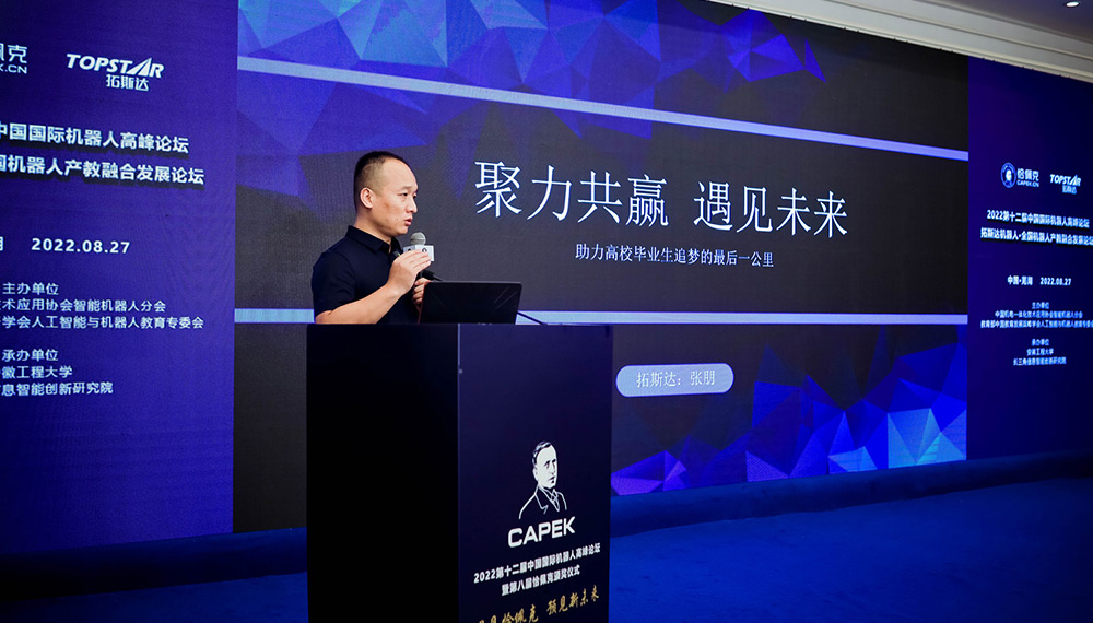 27日,在拓斯达冠名的恰佩克全国机器人产教融合发展论坛上,拓斯达董事、机器人事业部总经理张朋以“聚力共赢 预见未来——助力高校毕业生追梦的最后一公里”为题,与现场及线上的高校专家学者们共同探讨“如何培养更符合市场需求、更贴合实际的技术人才”,来解决当下“产品多,技术人员短缺”的行业痛点。