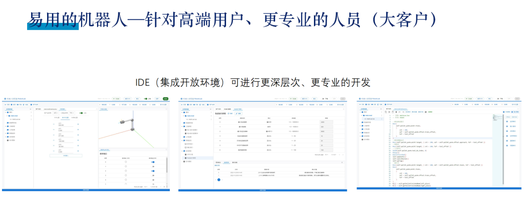 针对高端用户复杂场景、有专业人员操作的,机器人以零部件的角色集成到产业链当中去,开放了IDE(集成开发环境)可以充分满足专业人员进行更深层次、更专业的开发来满足多种复杂场景的应用需求。