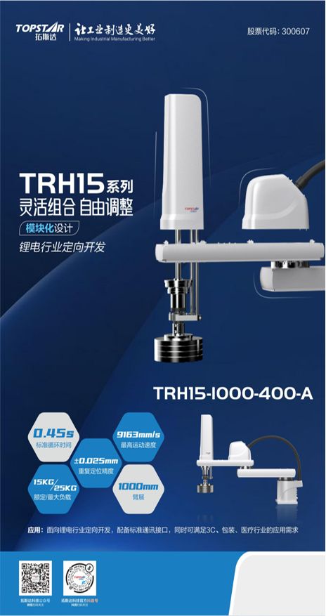 此外,为满足新能源行业的应用需求,拓斯达推出全新TRH15系列高负载SCARA机器人,给新能源行业带来更灵活和人性化的产品体验。TRH15负载15-25KG,底座、大臂、小臂的模块化设计可实现臂展灵活组合,满足叠片段测试上下料、电芯段搬运、组装等工艺段的应用需求。