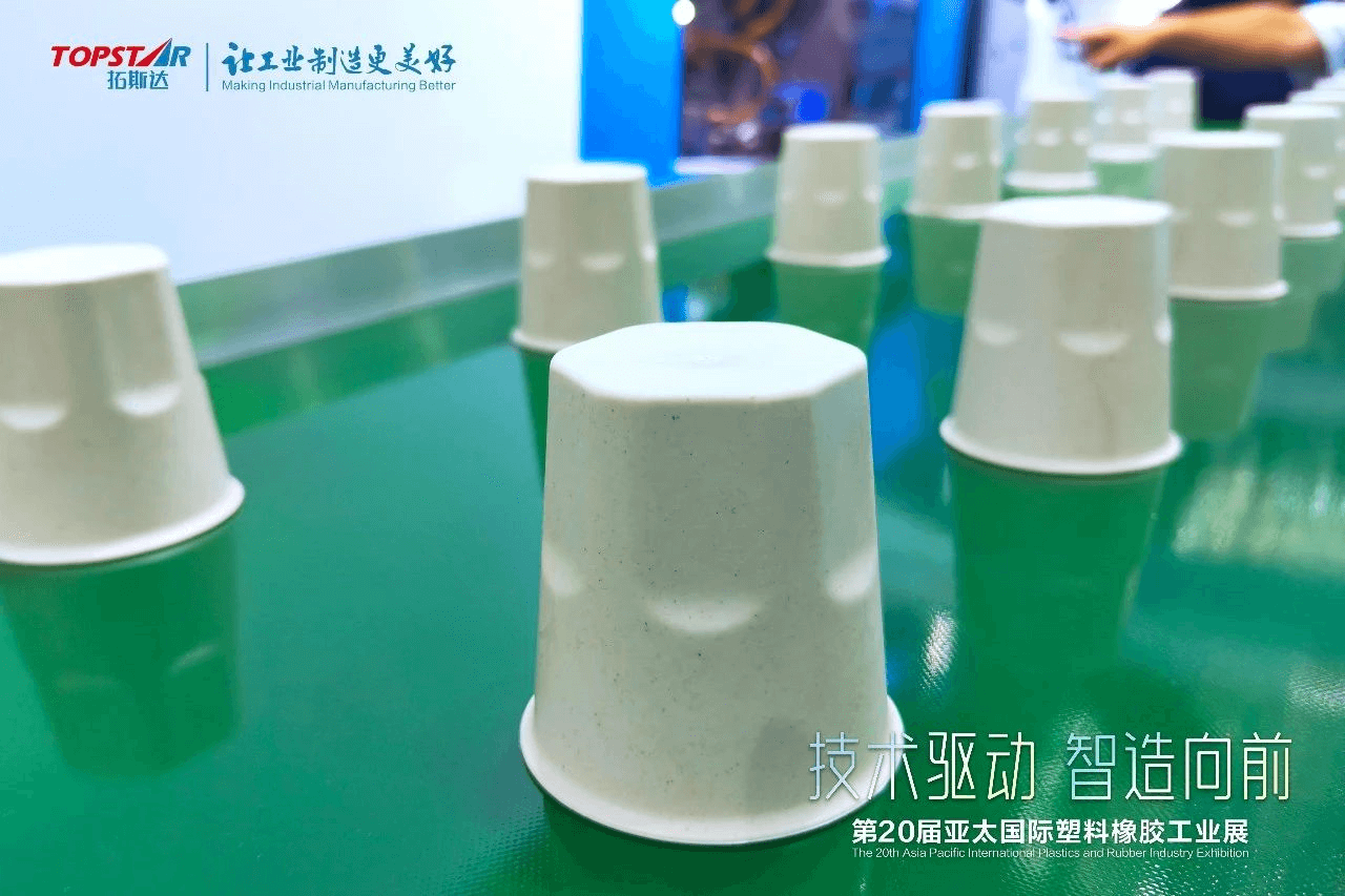 在环保新材料注塑成型工艺方面,拓斯达注塑机表现同样亮眼。其中,由TS220注塑机生产的水杯产品采用可降解的稻壳纤维生物质原材料,这一解决方案需应对稻壳纤维原料的特殊性,如粘性、流动性等挑战,同时要求高精度和稳定性,以确保产品尺寸一致性和外观品质。