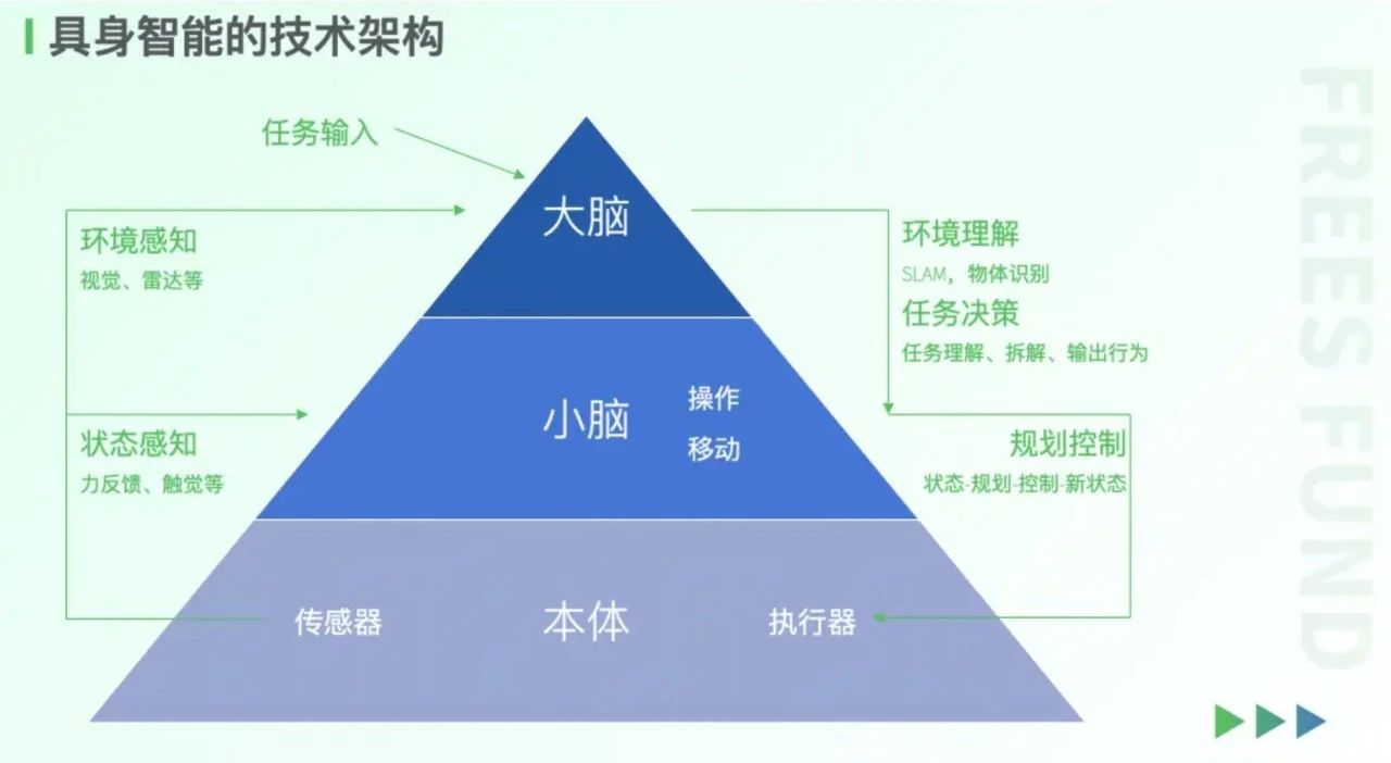 【身体】负责行动,包含机器人的物理结构和执行器,它根据小脑层的运动规划,实际操作机器人的各个关节和组件,完成既定的任务。